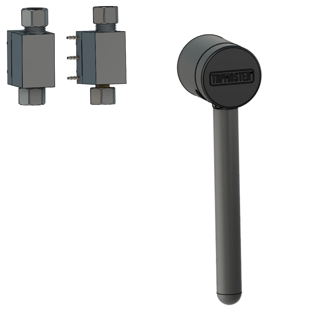 Foot activator for a typical faucet installation with both a hot and cold water line running to the faucet. Works with most faucets from most manufacturers. Standard Tapmaster probe-style activator. Includes continuous flow option.